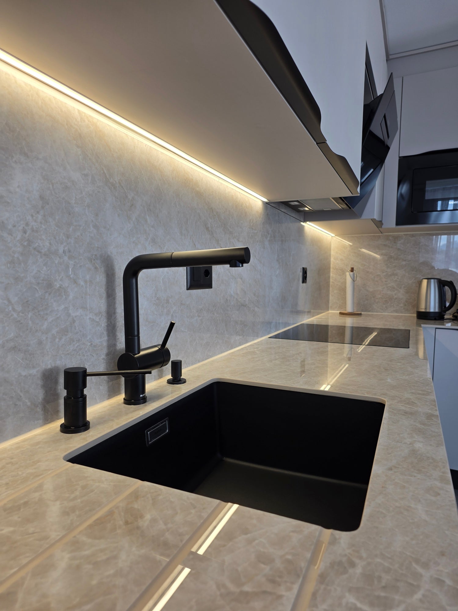 Kaschmirfarbene Fronten kombiniert mit Laminam-Keramik und schwarzen Akzenten schaffen eine ruhige, zeitlose Gestaltung.