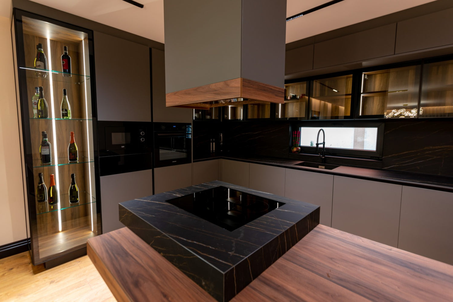Graue, grifflose Fronten kombiniert mit schwarzer Keramik in Marmoroptik und Holzakzenten prägen das architektonische Design.